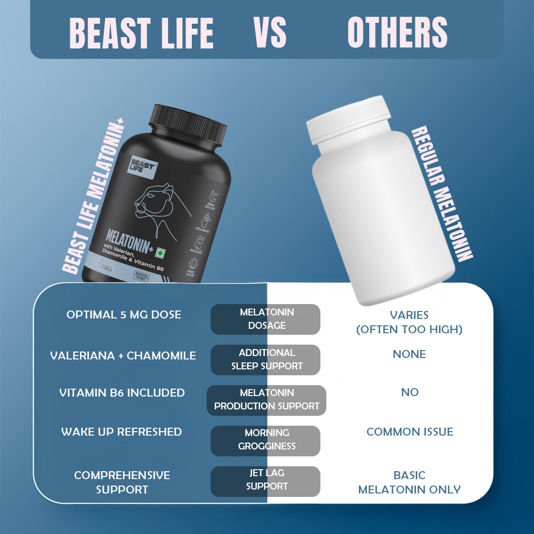 Beast Life Melatonin+ is your natural way to unlock deep, restful sleep. Powered by Valeriana wallichii, Chamomile, and 5mg of Melatonin, this synergistic blend promotes relaxation, supports a healthy sleep cycle, and helps you wake up refreshed, not groggy.