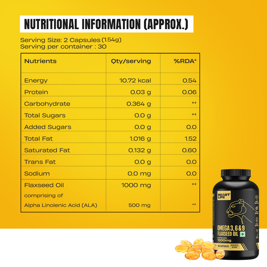 The power of 3X healthy triglycerides(1000mg) with Veg Omega 3-6-9 A perfectly balanced blend of Omega-3 (ALA), Omega-6 (LA), and Omega-9 (Oleic Acid), and a sustainable alternative to non-veg sources
