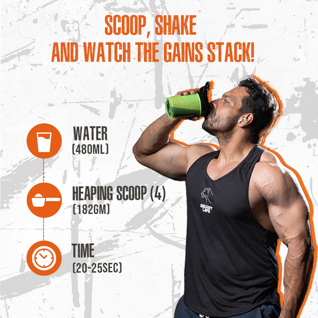 - Add 4 heaping scoops of Beast Life's Mass Gainer.