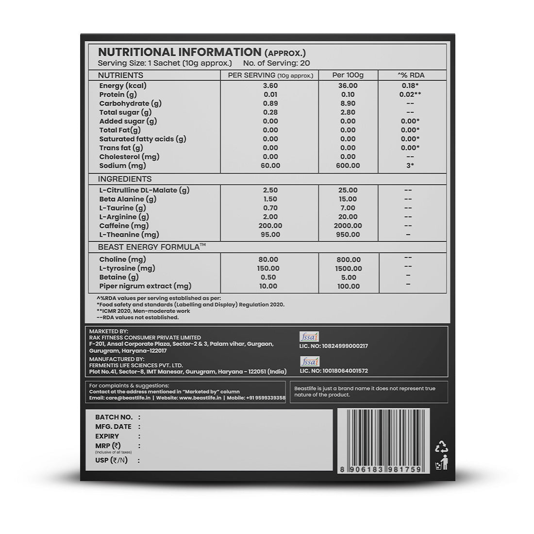 Beast Energy Formulaā¢: Every sachet is powered with Ā Beast Energy Formulaā¢, which drive focus, endurance, and performance beyond limits.