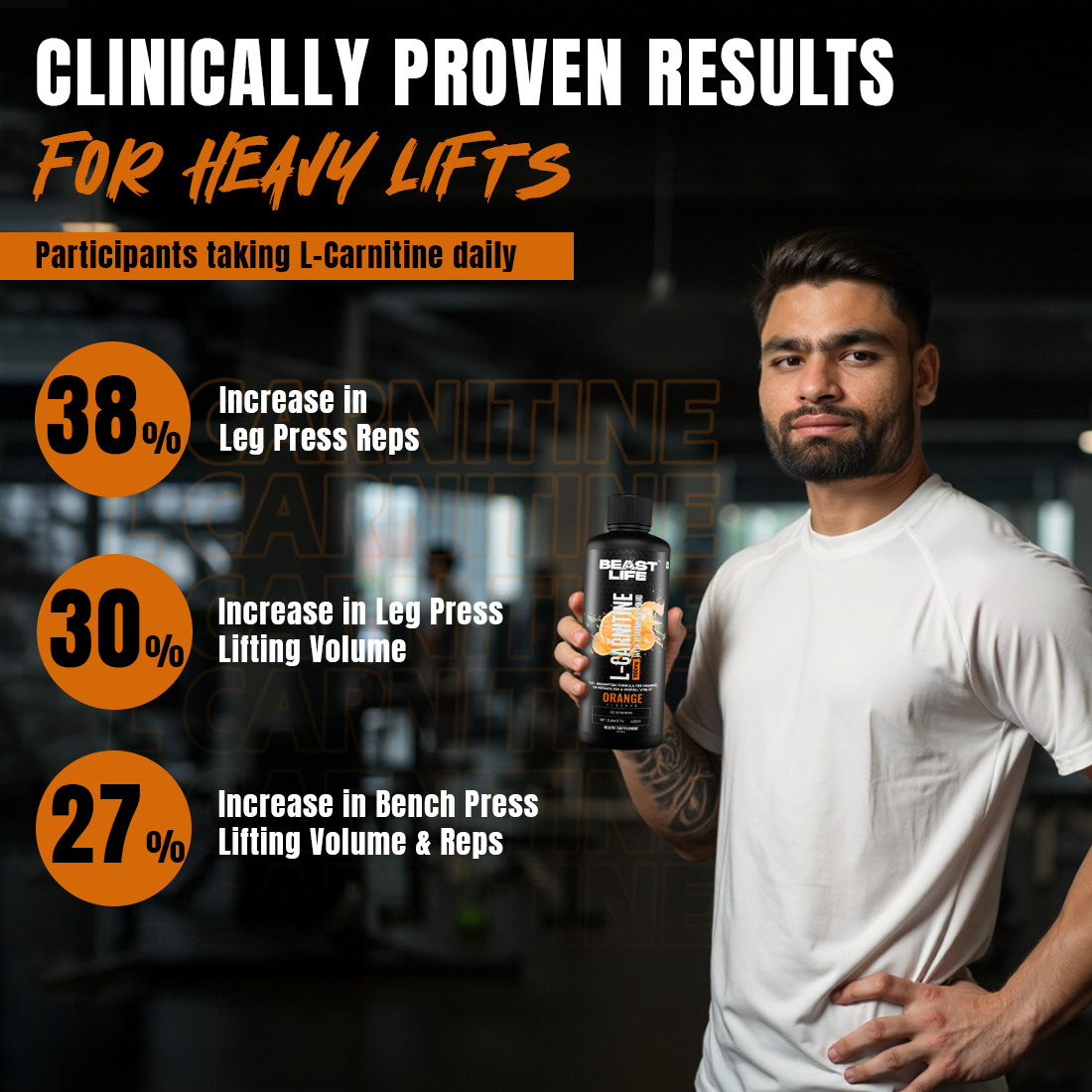 CLINICALLY PROVEN FOR HEAVY LIFTS โ Participants taking 2g L-Carnitine daily observed 38.1% Increase in Leg Press Reps, 30.2% Increase in Leg Press Lifting Volume, and 27.5% Increase in Bench Press Lifting Volume & Reps.