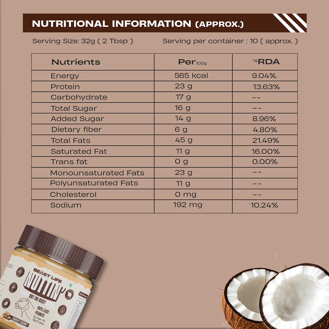 Beast Lifeās Coconut Crunchy Peanut Butter blends roasted Junagadh peanuts with real coconut, for a high-protein snack that feels indulgent, but isnāt.