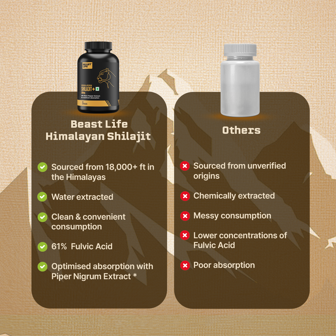 500mg of pure, high-altitude Shilajit with 5mg of Piper Nigrum to deliver better absorption compared to standard formulations.