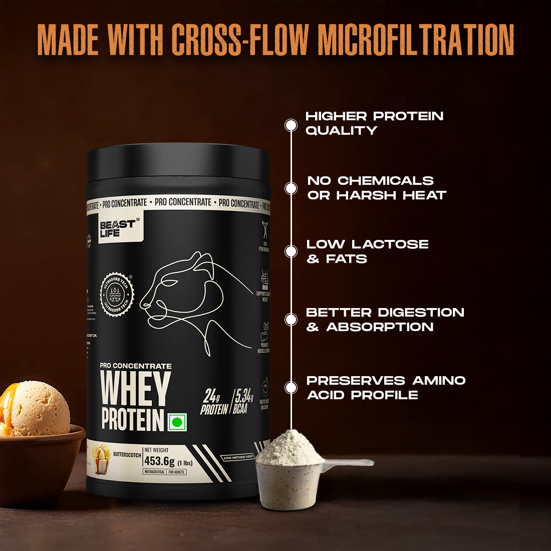 100% Premium Whey Concentrate, crafted using the CFM (Cross-Flow Microfiltration) process. Powered by Ultrasorb Tech™ for max protein absorption without any digestive discomfort.