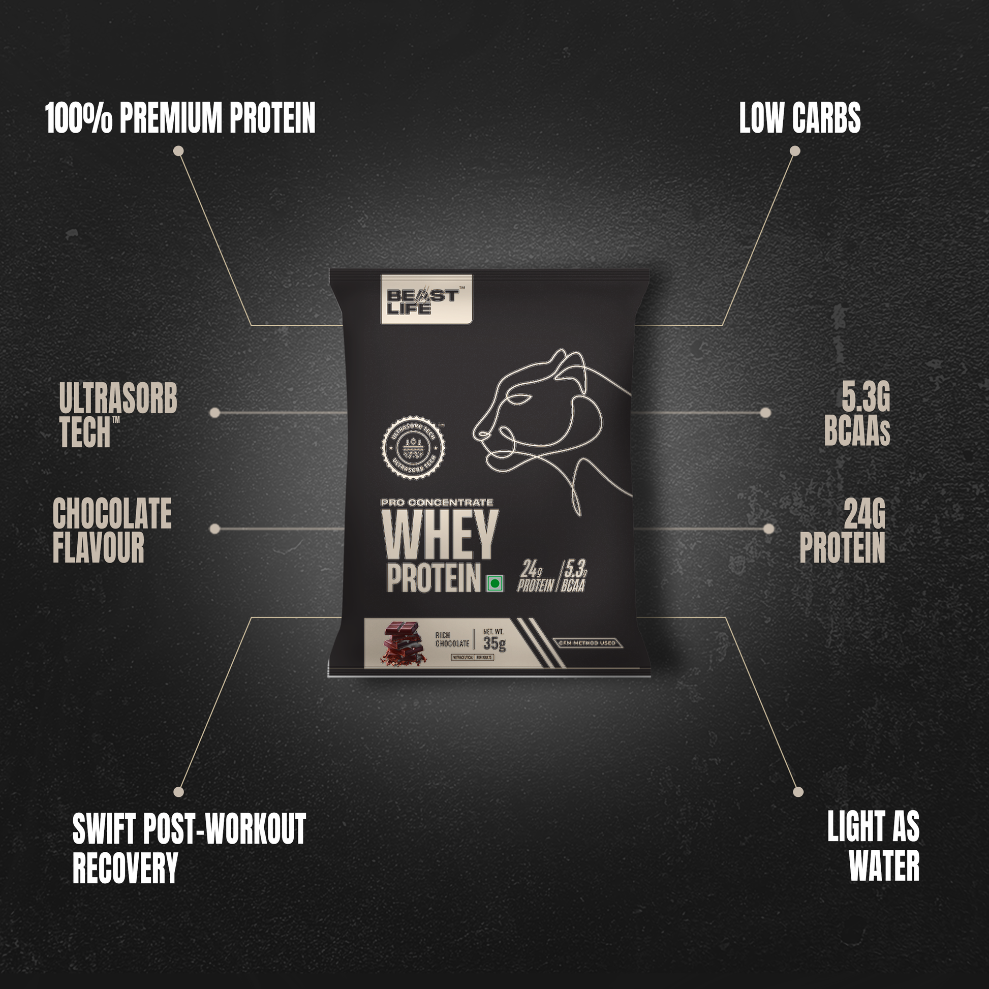 100% Premium Whey Concentrate, crafted using the CFM (Cross-Flow Microfiltration) process. Powered by Ultrabsorb Tech™ for max protein absorption without any digestive discomfort.